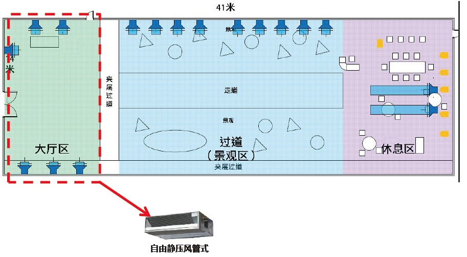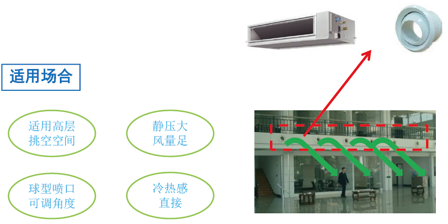 自由靜壓風管機設備+球型噴口的空調方案。