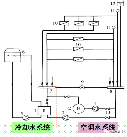 1-水冷冷水機(jī)組 ;2-鍋爐 ;3-冷凍水泵 ;4-熱水泵 ;5-冷卻水泵 ;6-冷卻塔 ;7-分水器;8-集水器 ;9-壓差控制閥 ;10-空調(diào)設(shè)備 ;11-自動排氣閥 ;12-膨脹水箱 ;13-閥門