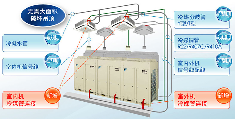 針對(duì)改造的“工期”“資金”“影響”三大難題,大金VRV更新用Q系列利用先進(jìn)的技術(shù),解決用戶對(duì)空調(diào)改造的擔(dān)憂。